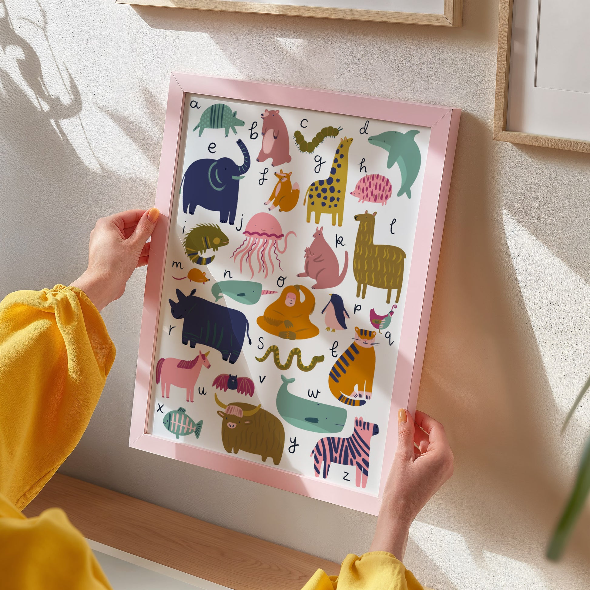 An original alphabet design by Lauren Radley, featuring colourful, hand drawn and cute illustrations of animals ranging from A to Z. Perfect for a children’s nursery or the home of any wildlife lover.