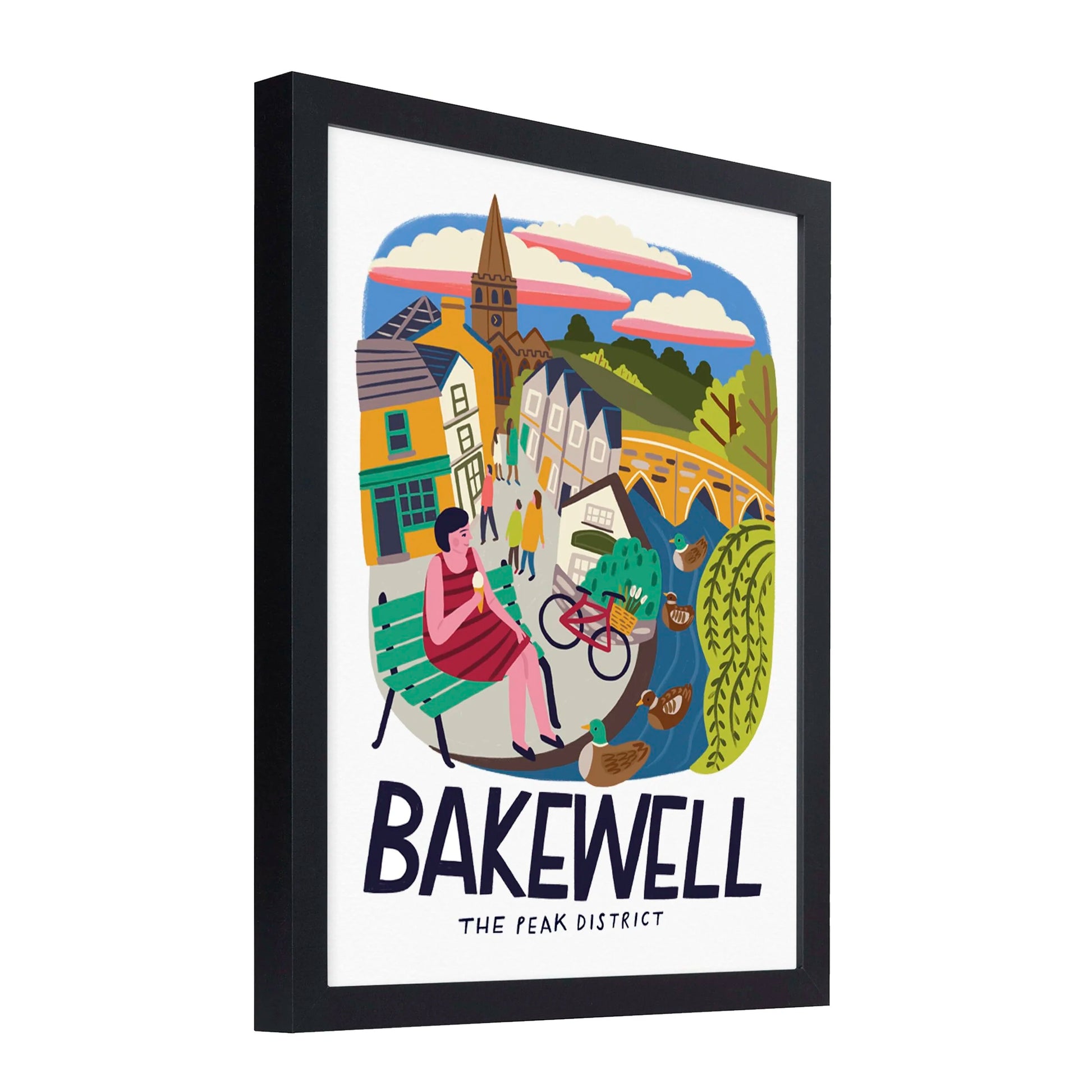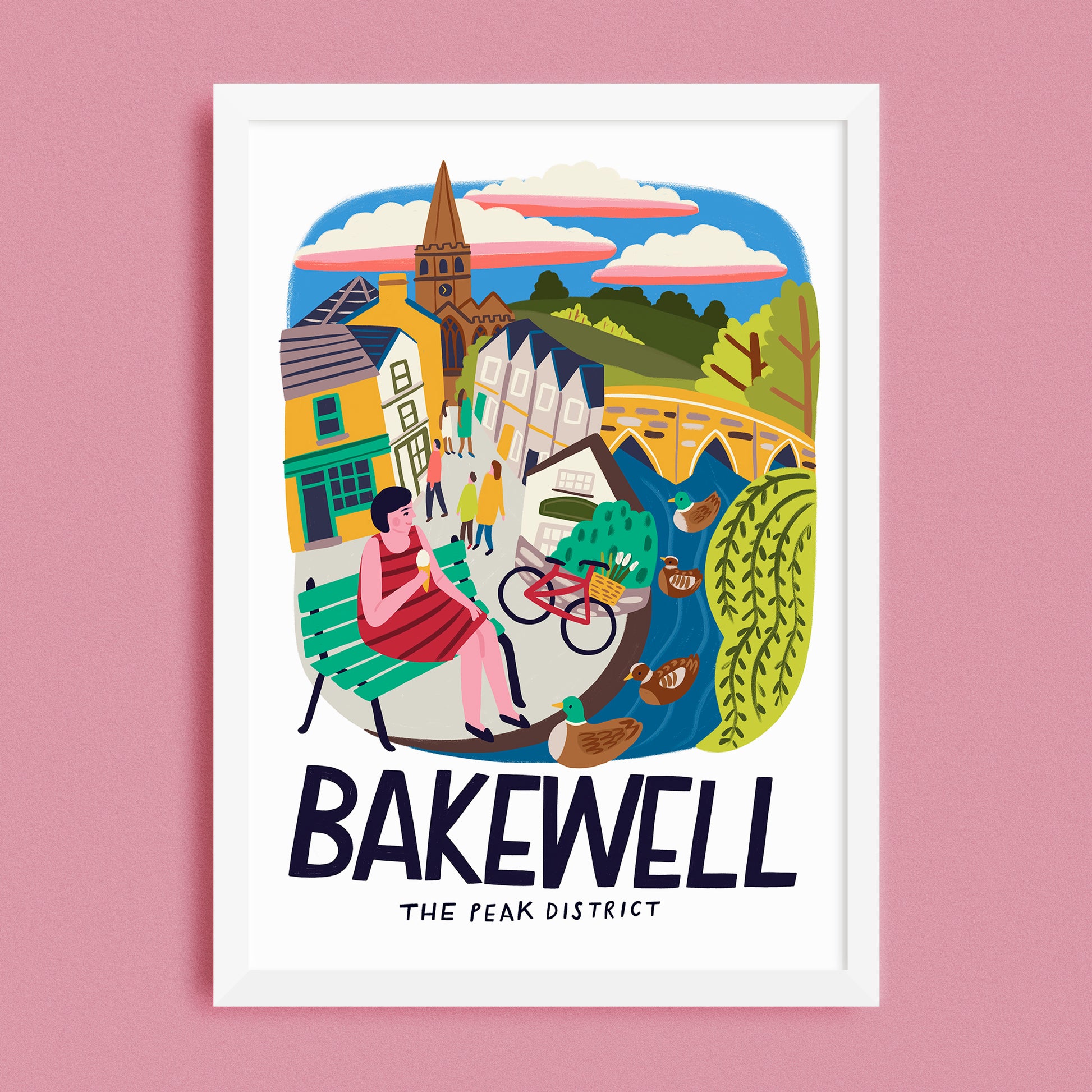 Celebrate the charming village of Bakewell with this vibrant illustrated poster inspired by classic travel design. Featuring the famous Peak District location, it's one of twelve delightful prints in Lauren Radley's collection.