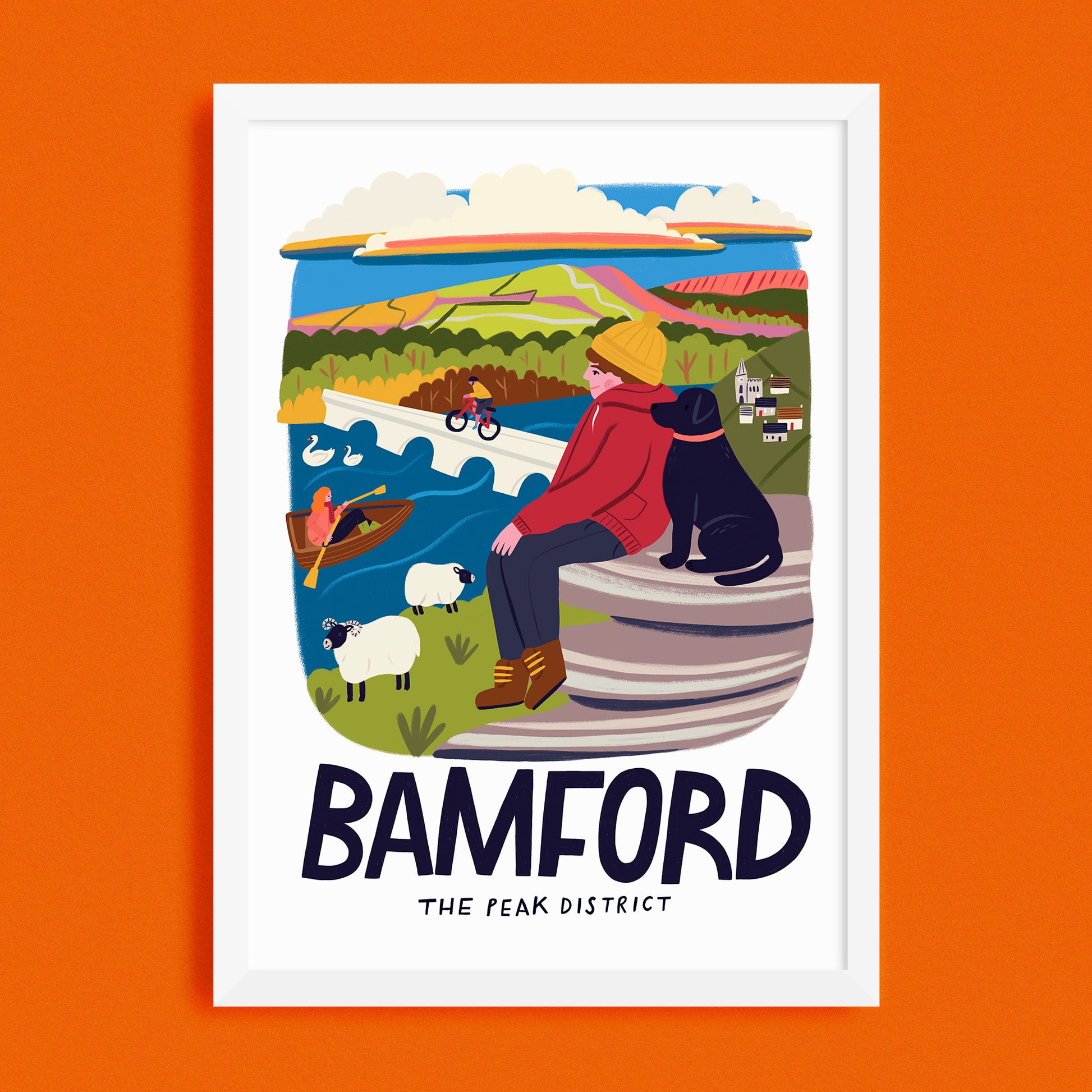 An original design by Lauren Radley. Inspired by Vintage Railway and travel posters, and featuring a colourful, hand drawn illustration of the beautiful village of Bamford. One from a collection of twelve illustrations of different towns and villages in The Peak District.