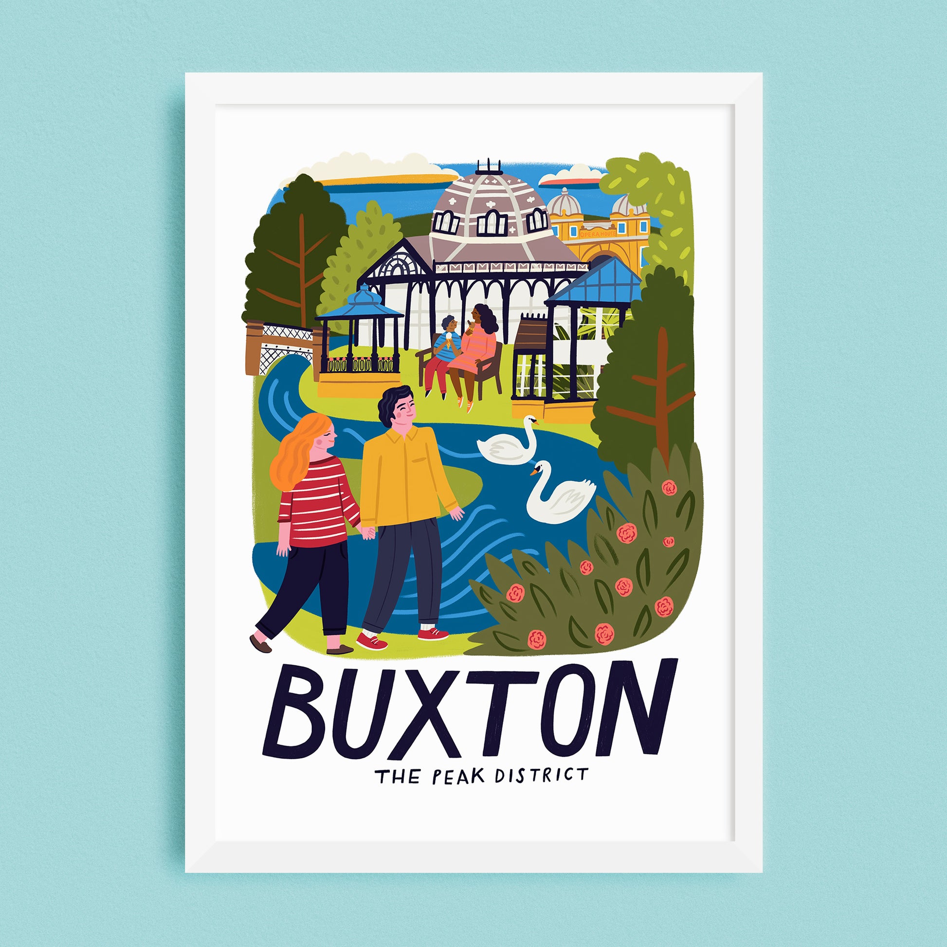 Capture the charm of Buxton with this vibrant illustrated poster in classic travel style. Featuring hand-drawn artwork, it's one of twelve delightful Peak District locations in Lauren Radley's nostalgic collection.