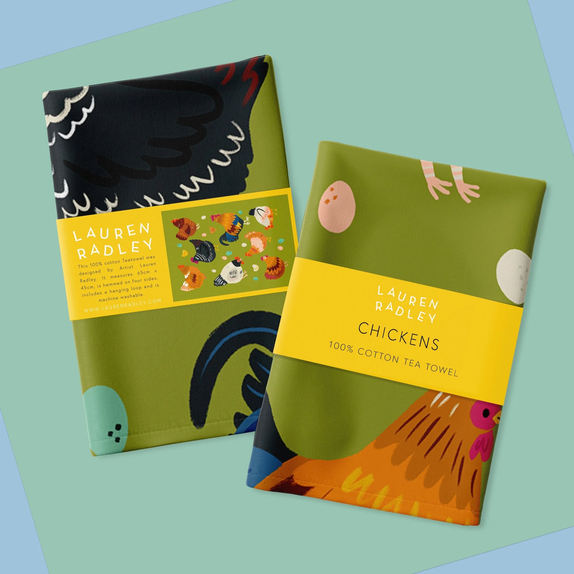 This original design by Lauren Radley features her bold, colourful chickens illustrations.