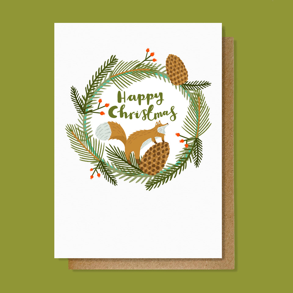 Christmas Fox Card - This beautifully hand illustrated Christmas wreath features a cute little fox and gorgeous brush lettering by Lauren Radley. The perfect way to send some Christmas cheer.