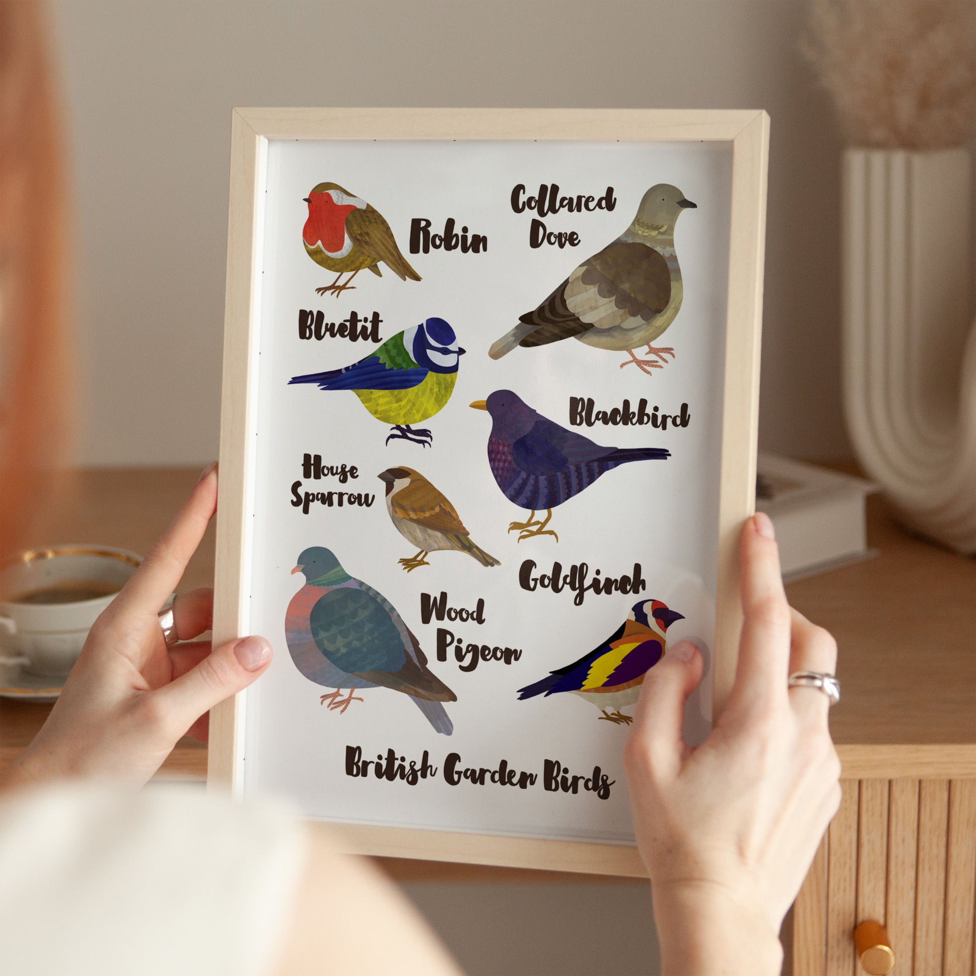 A cheerful print by Lauren Radley showcasing a delightful collection of British garden birds in vibrant, hand-drawn illustrations. Perfect for nature lovers and bird enthusiasts alike.