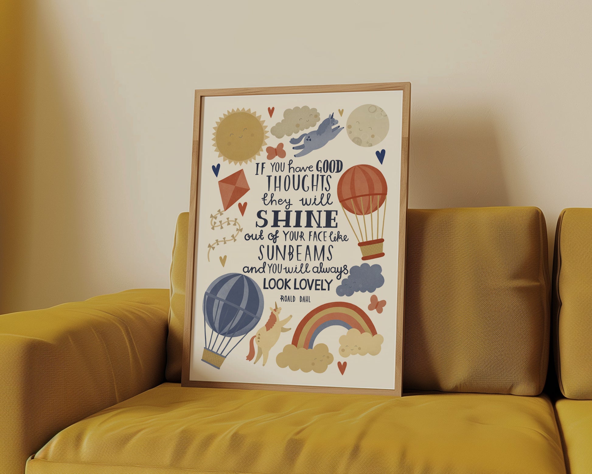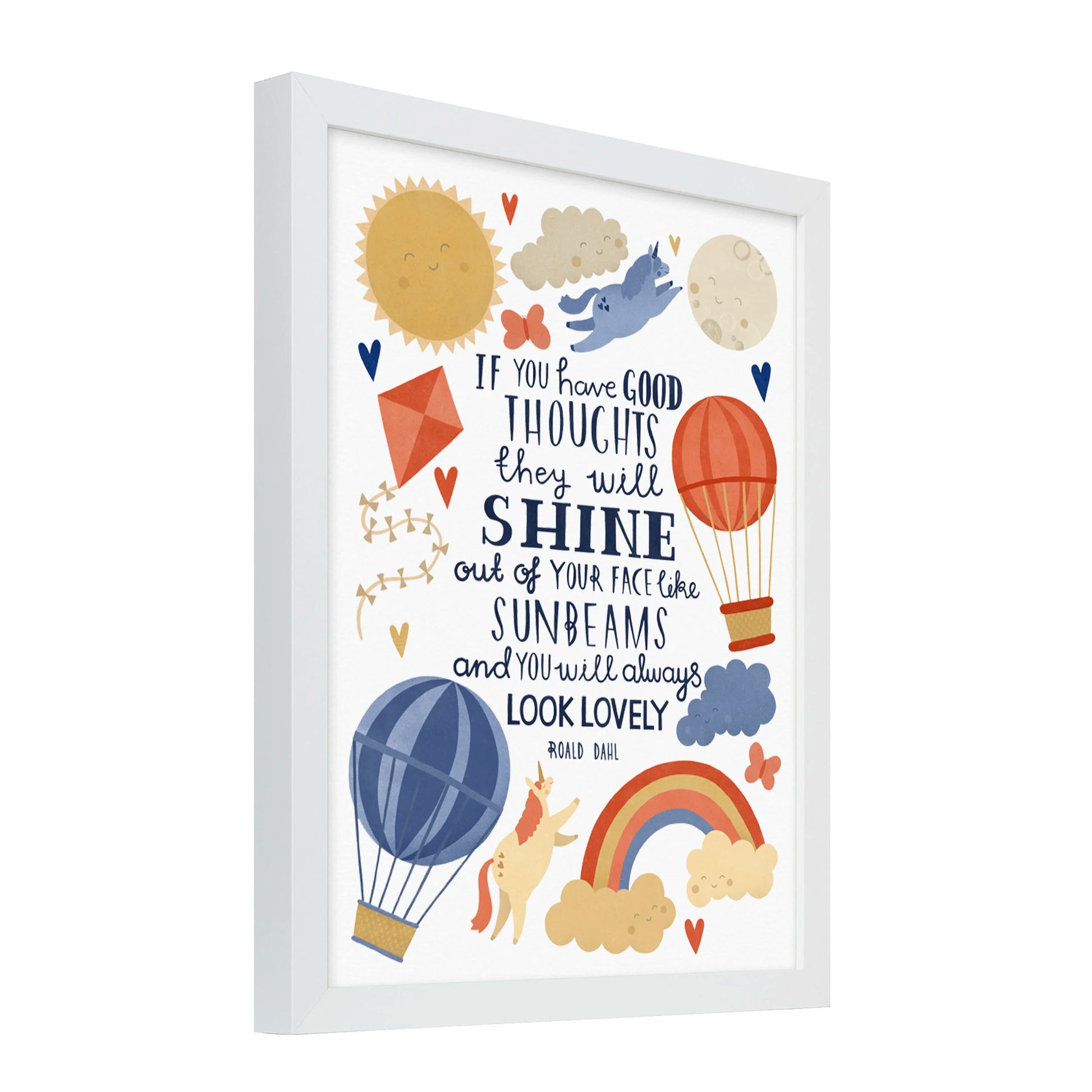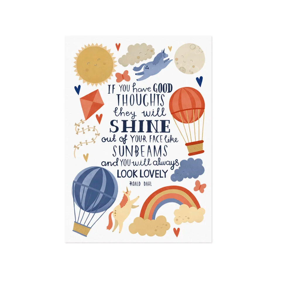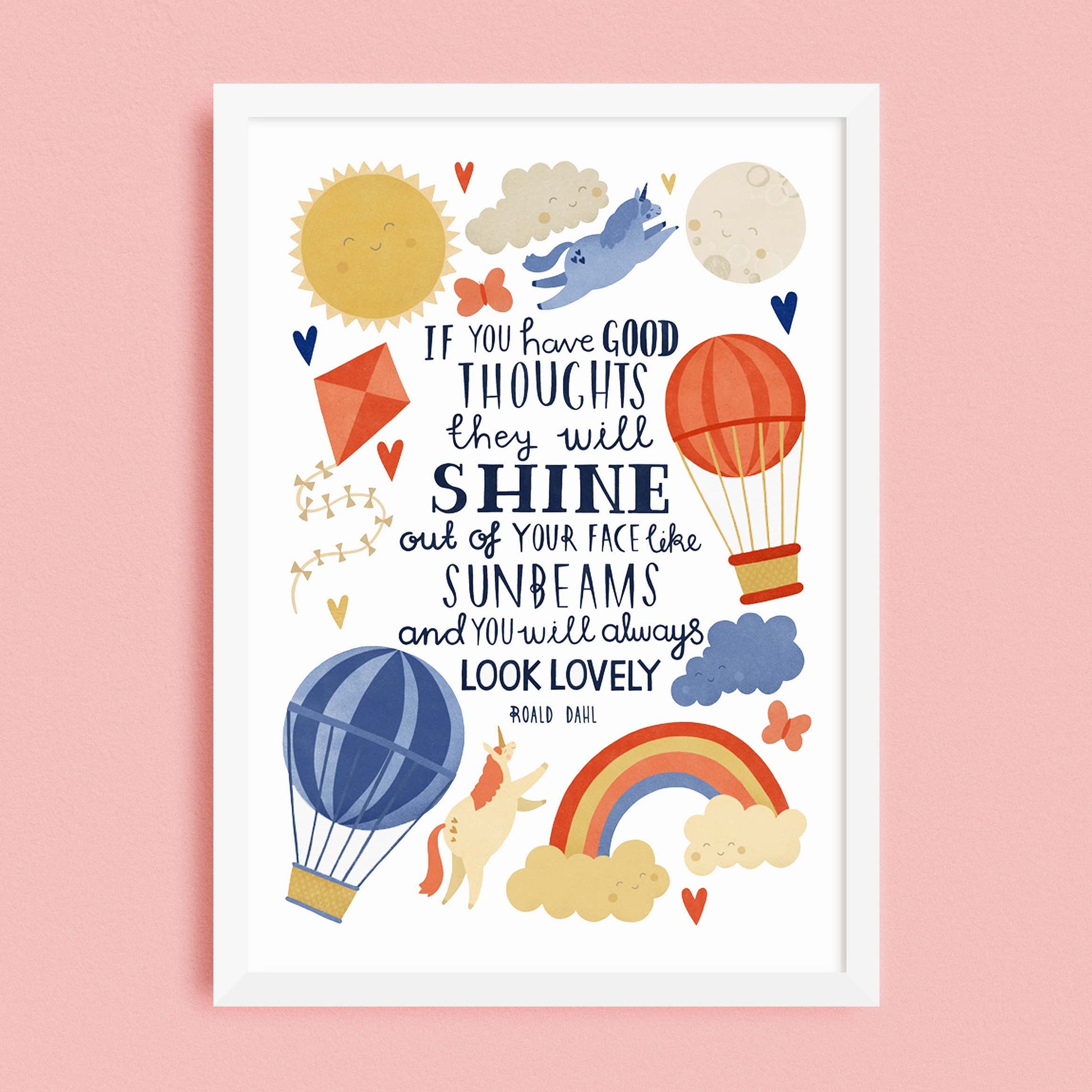 An original illustrated typographic design by Lauren Radley of the famous Roald Dahl quote. Hand illustrated text is surrounded by happy unicorns and joyful illustrations, making this a perfect print for a nursery, playroom or bedroom.