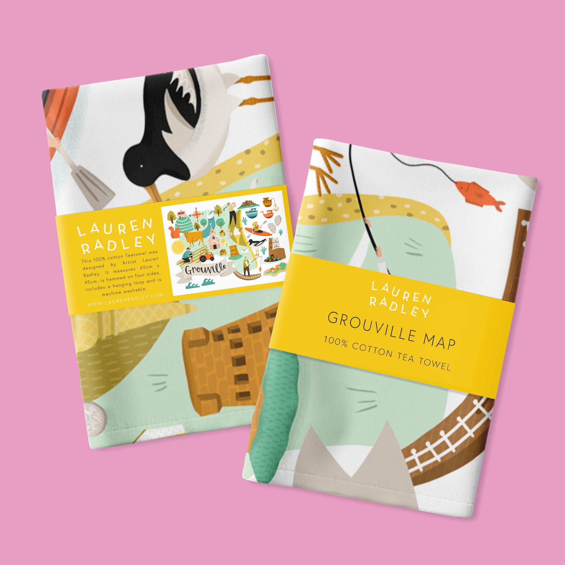 This original design by Lauren Radley is one from her range of gorgeous, unique hand illustrated maps. This cotton tea towel features a fun map of the East Parish of Grouville, Jersey. The colourful map is filled with landmarks and activities to do in the parish, including sea canoeing or eating delicious ice creams!