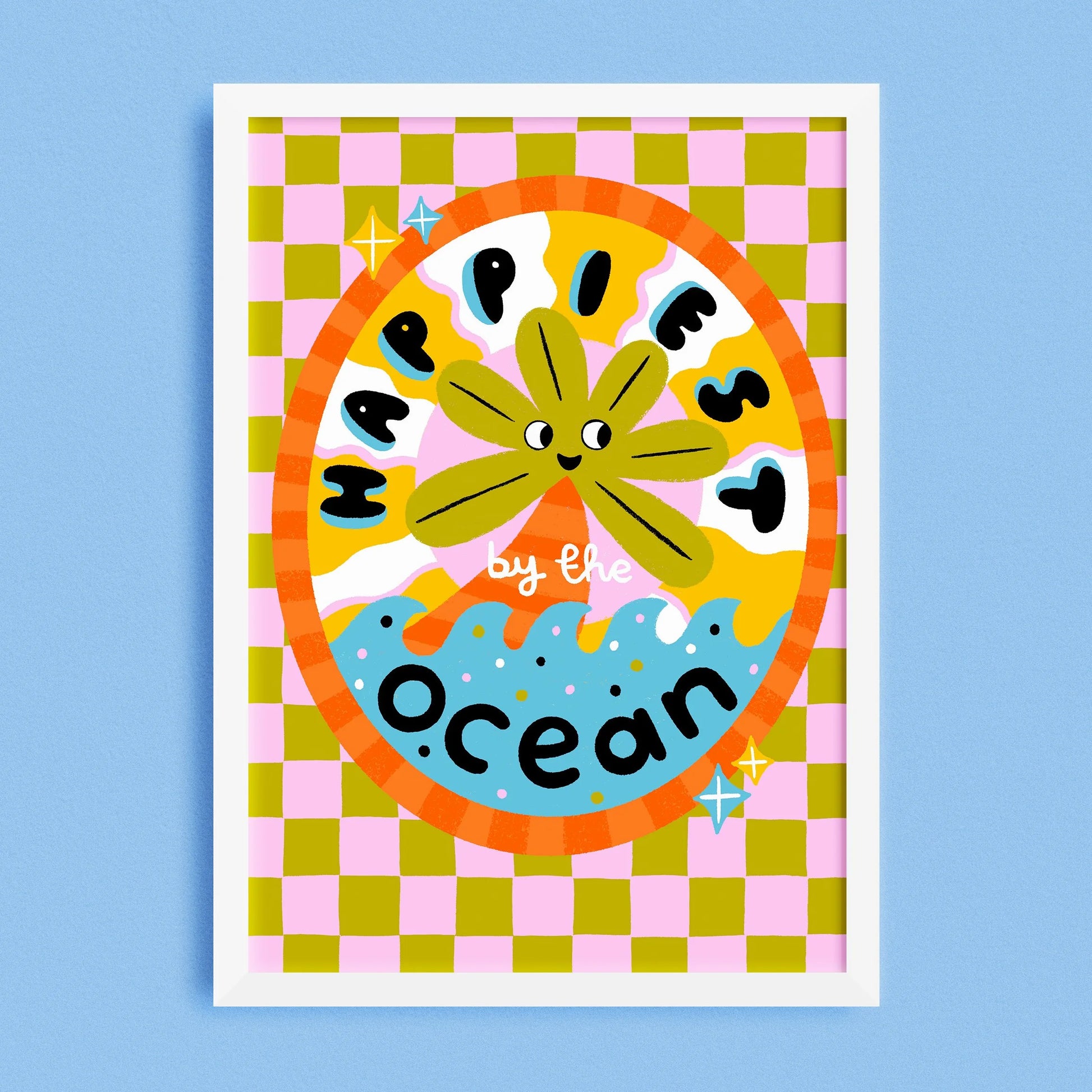 Embrace coastal joy with Lauren Radley's "Happiest By The Ocean" print. Bursting with sunny colours and feel-good energy, this design brings beachside bliss and infectious positivity to brighten your walls.