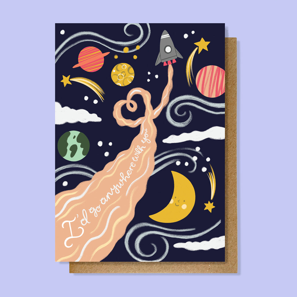 I’d Go Anywhere With You. From our new ‘Adventure Valentines’ range; this cute space scene has a romantic massage written amongst the stars…