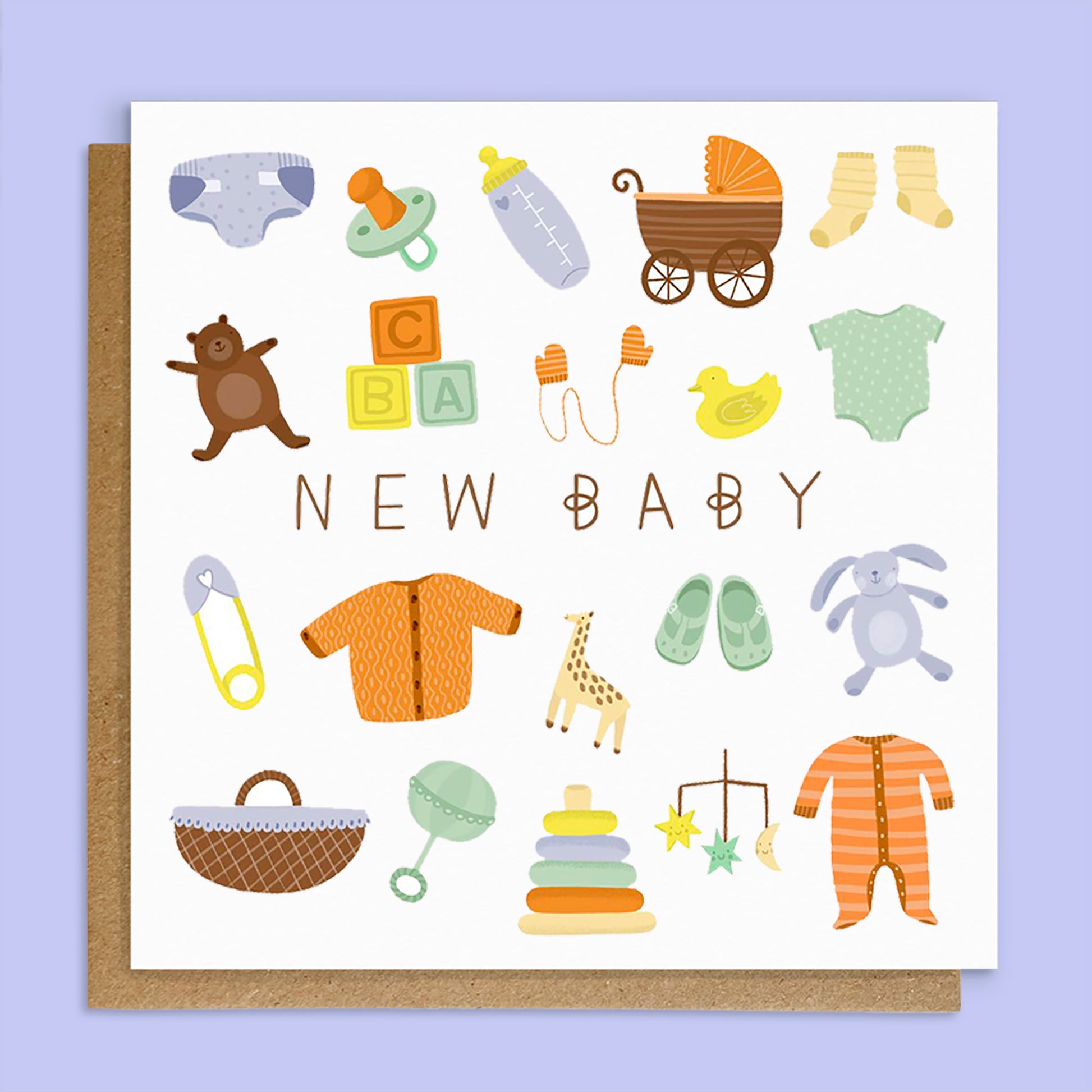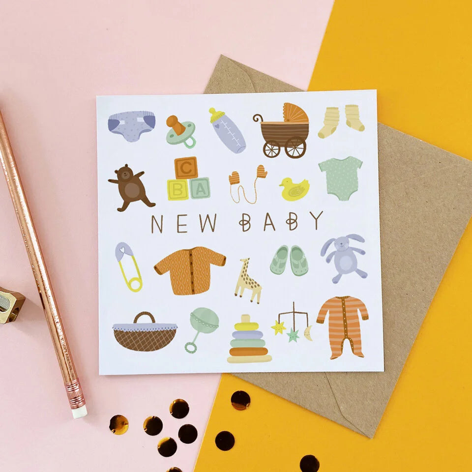 New Baby Card - Celebrate a new baby with this cute card illustrated by Lauren Radley. Featuring all the bits and bobs needed for the new arrival.
