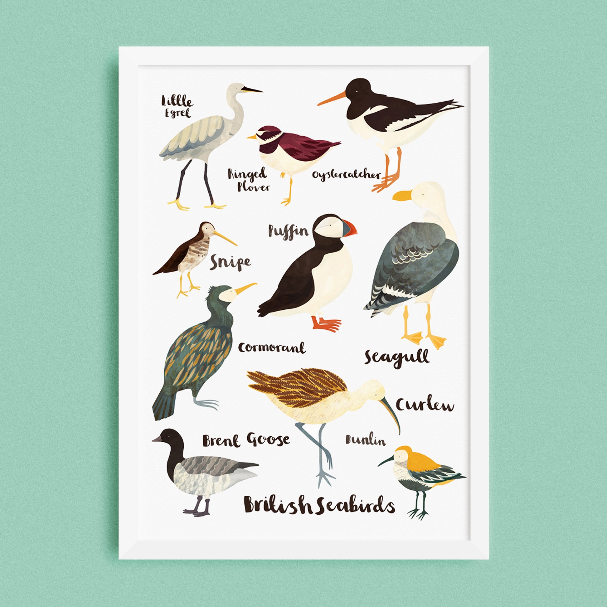 An original design by Lauren Radley featuring hand drawn illustrations of British seabirds.