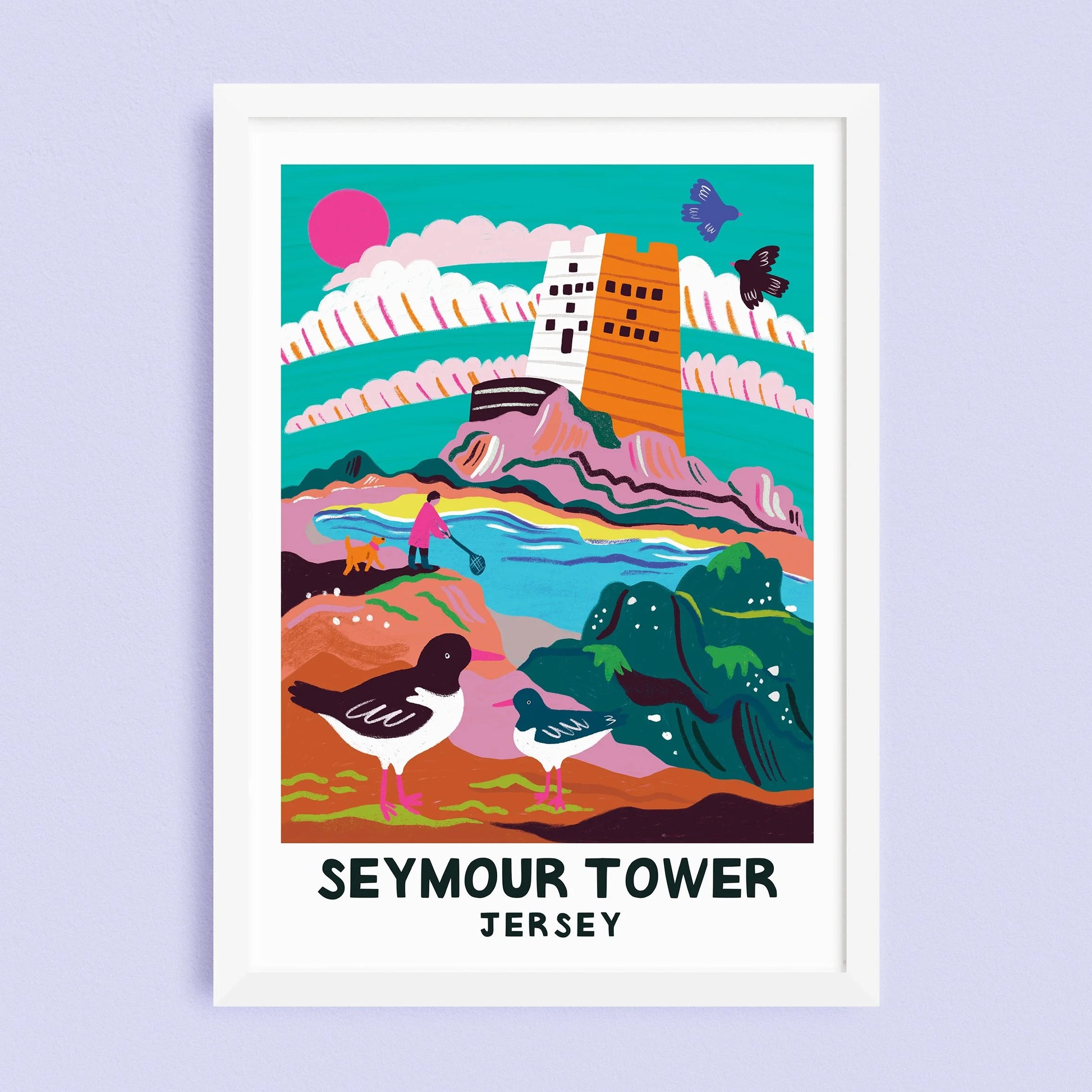 Celebrate Jersey's iconic landmark with Lauren Radley's "Seymour Tower" print. This charming design captures the island's maritime heritage with vibrant colours and playful detail, bringing local pride to your walls.