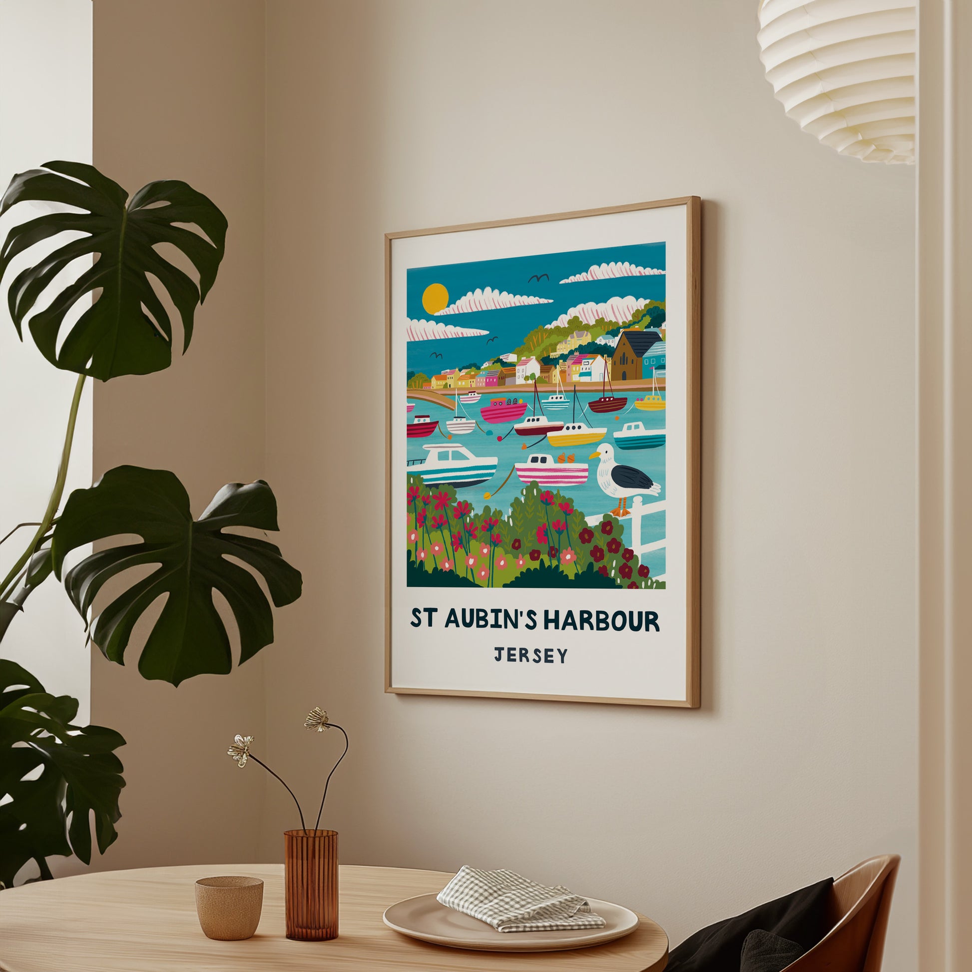 Discover St Aubin's Harbour through Lauren Radley's playful illustration, brimming with seaside charm and Jersey character. This vibrant print captures the picturesque harbour's magic—perfect for coastal lovers and island enthusiasts alike.