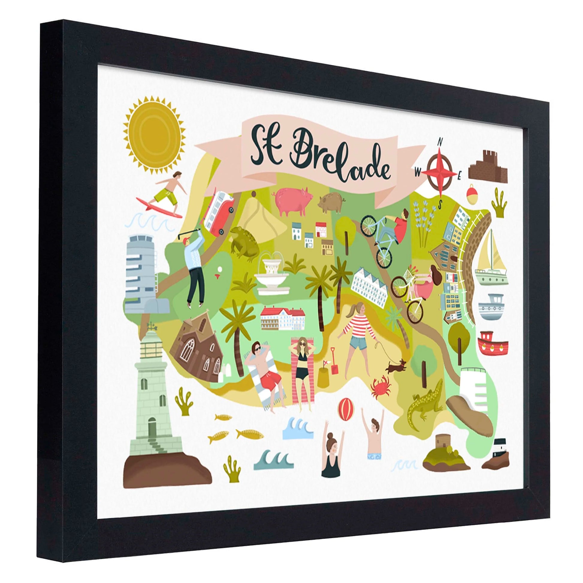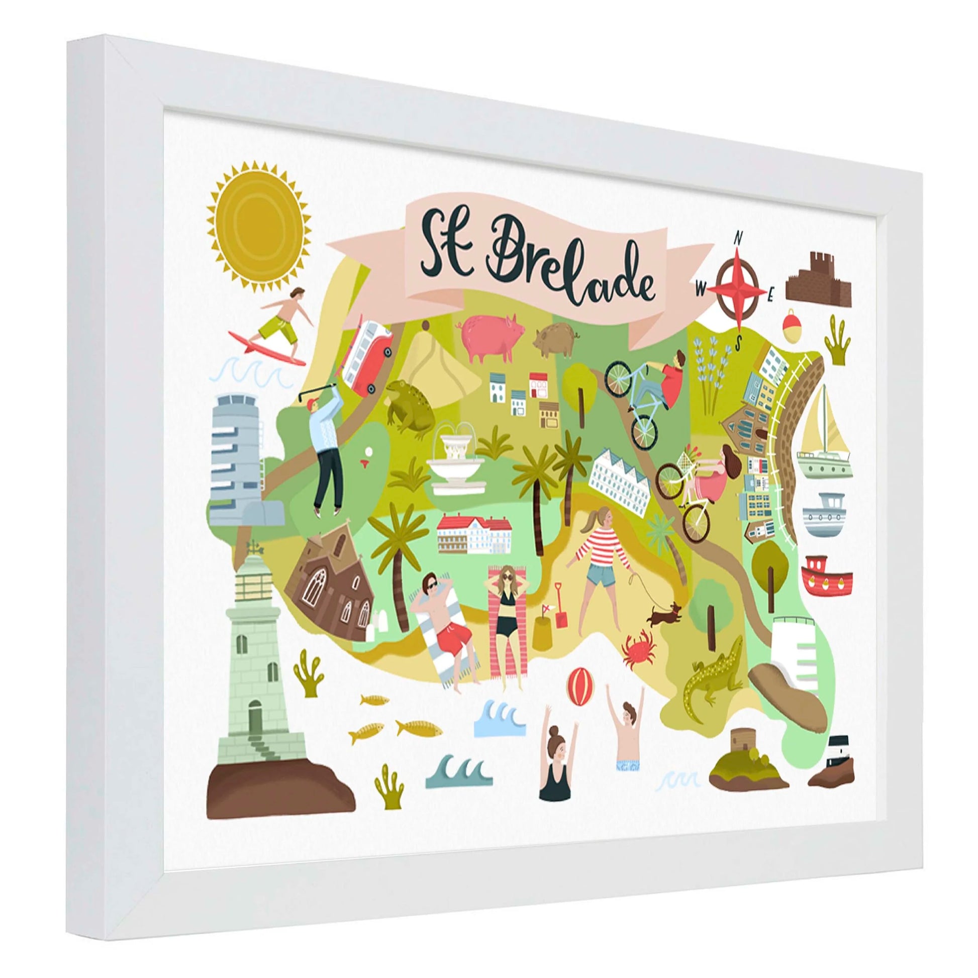 An original, colourful illustrated map design by Lauren Radley. Featuring hand drawn illustrations of landmarks and locations in the Parish of St Brelade in Jersey, the Channel Islands. The ideal print to give as a gift or for anyone wanting to capture their home Parish!