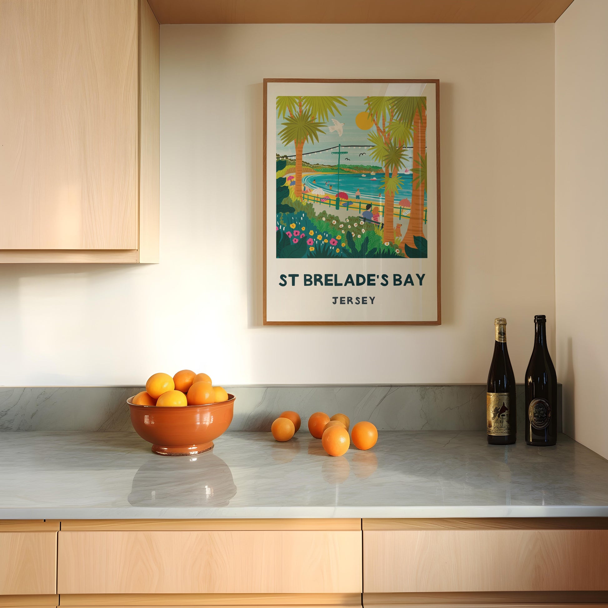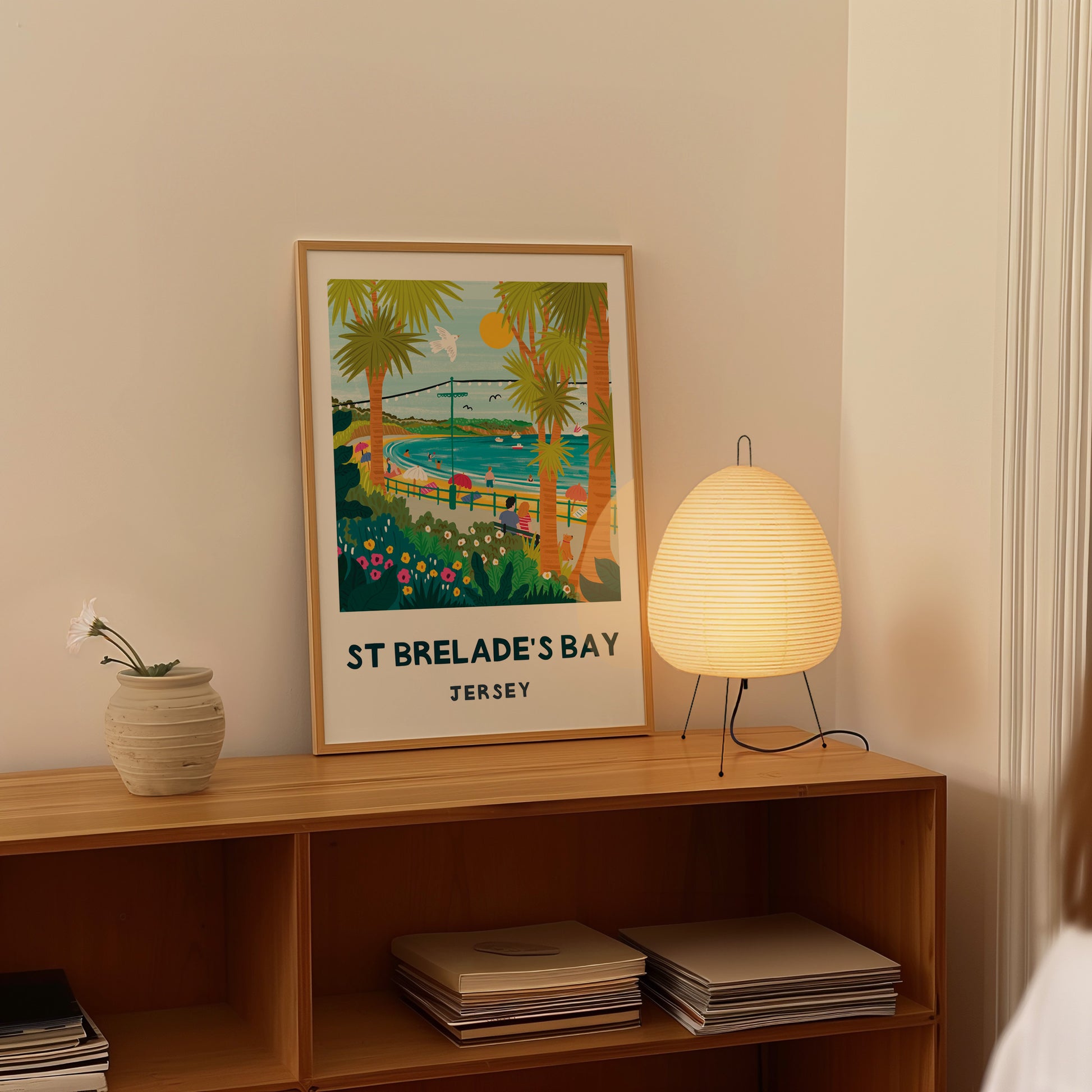 Discover St Brelade's Bay through Lauren Radley's playful print, brimming with Jersey's golden sands and seaside magic. This vibrant illustration celebrates one of the island's most beloved beaches—perfect for coastal dreamers and island enthusiasts alike.
