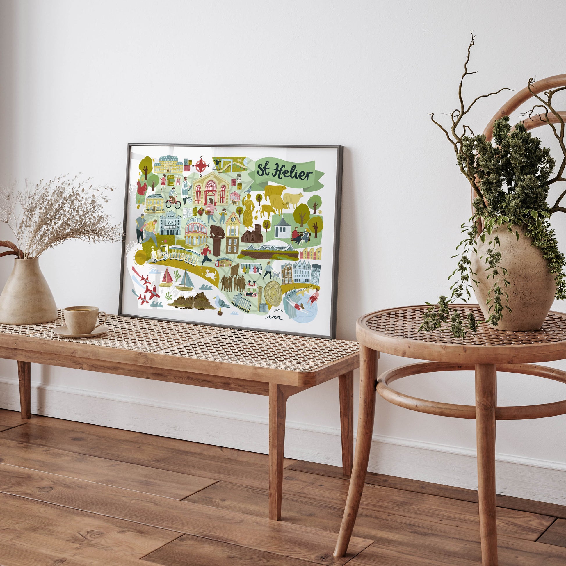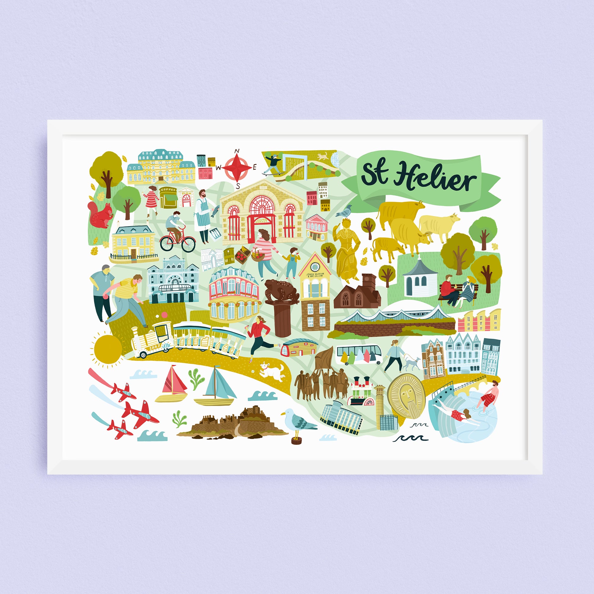 An original, colourful illustrated map design by Lauren Radley. Featuring hand drawn illustrations of landmarks and locations in the Parish of St Helier in Jersey, the Channel Islands. The ideal print to give as a gift or for anyone wanting to capture their home Parish!