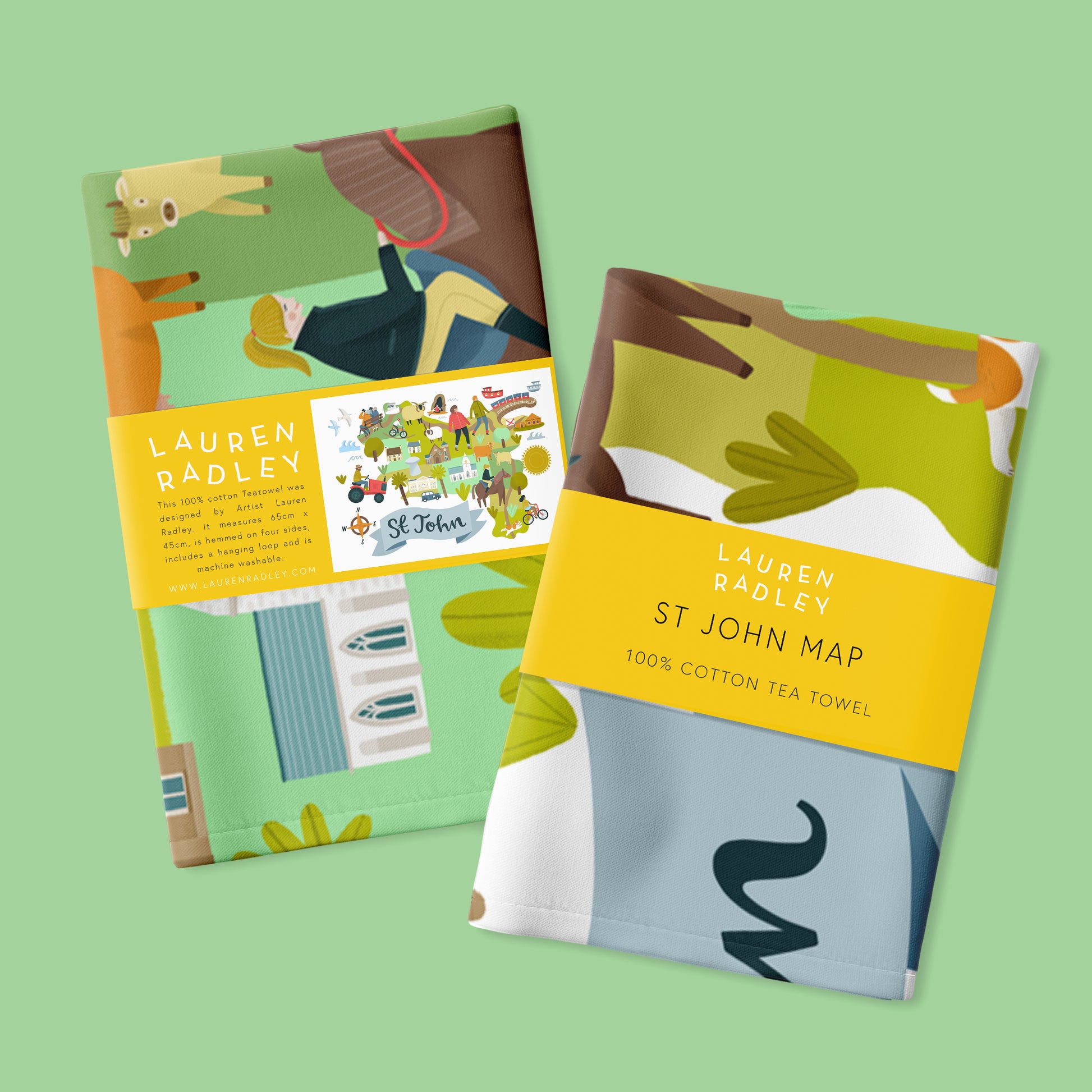 This original design by Lauren Radley is one from her range of gorgeous, unique hand illustrated maps. This cotton tea towel features a fun map of the quiet Parish of St John, Jersey, showing landmarks and activities to do in the parish, including walking the coastal paths or horse riding down country lanes.