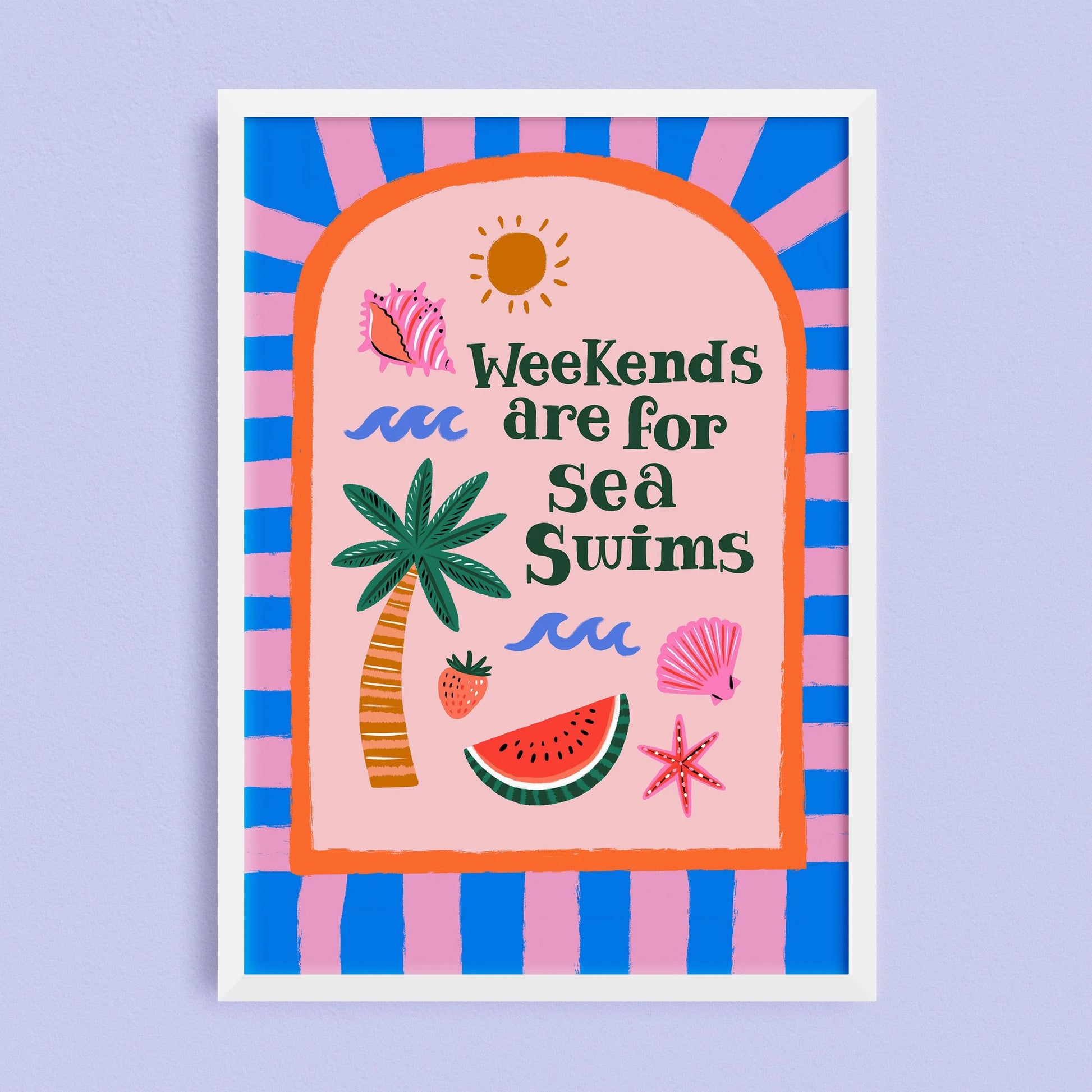 Celebrate weekend adventures with this spirited Lauren Radley print. A playful ode to seaside swimming and carefree coastal escapes, perfect for inspiring aquatic joy and weekend wanderlust.