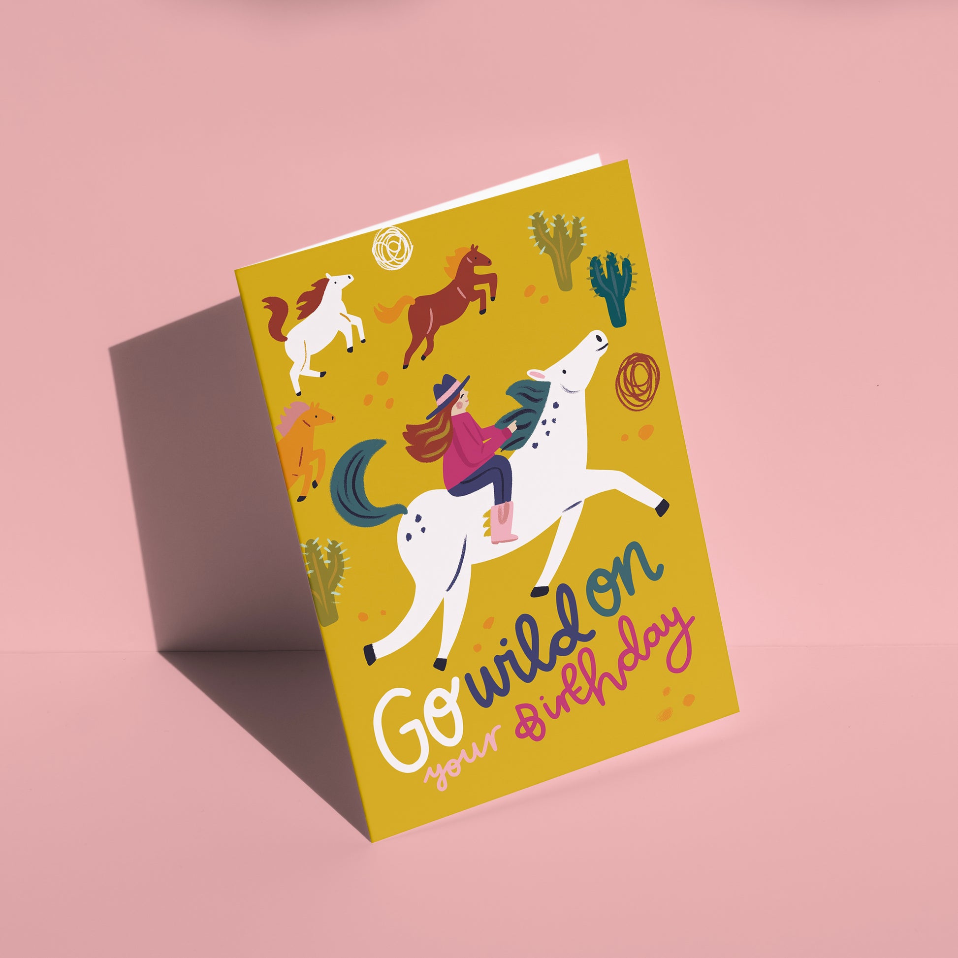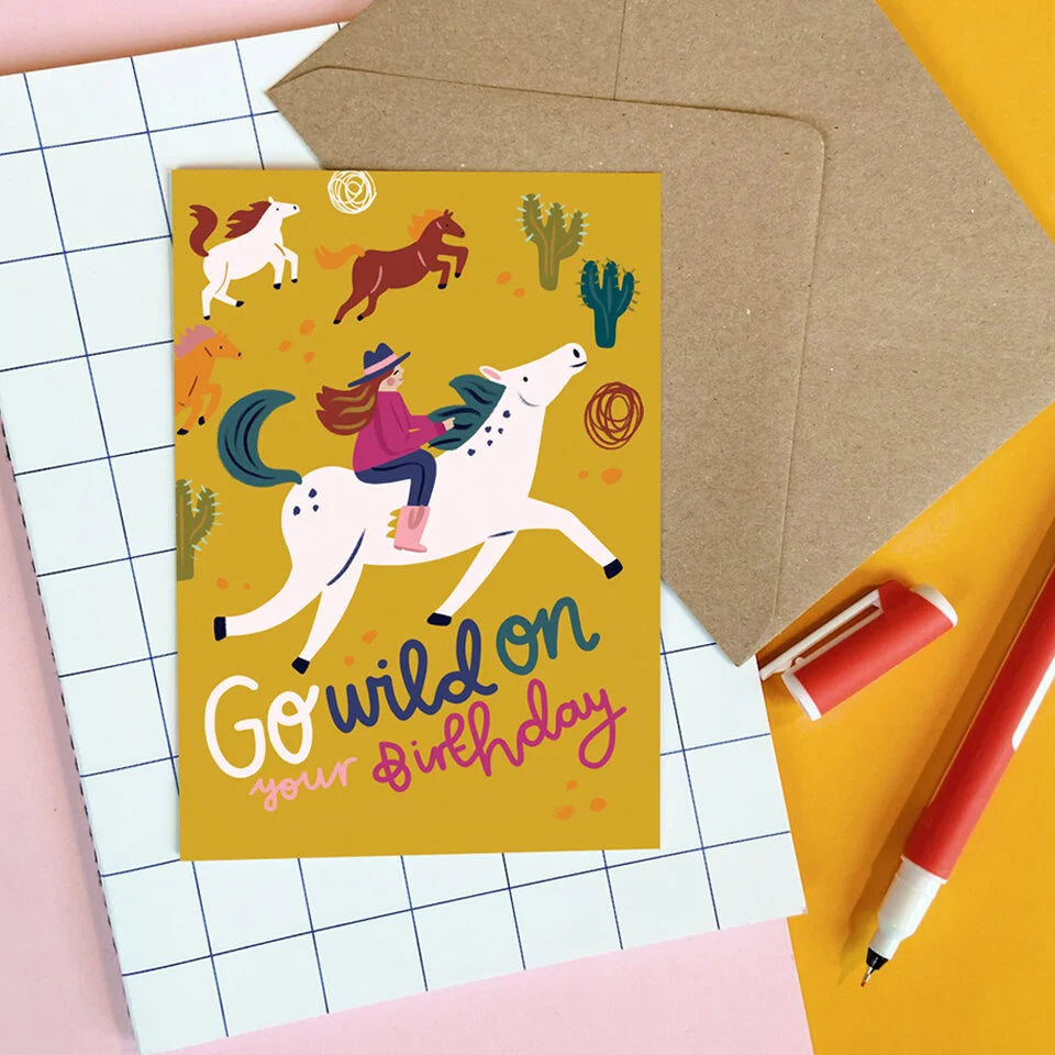 Wild Birthday Card - Featuring Lauren Radley’s illustration of a cowgirl riding her birthday pony through the desert. Perfect to send some love to any wild, horse loving girls on their birthday.