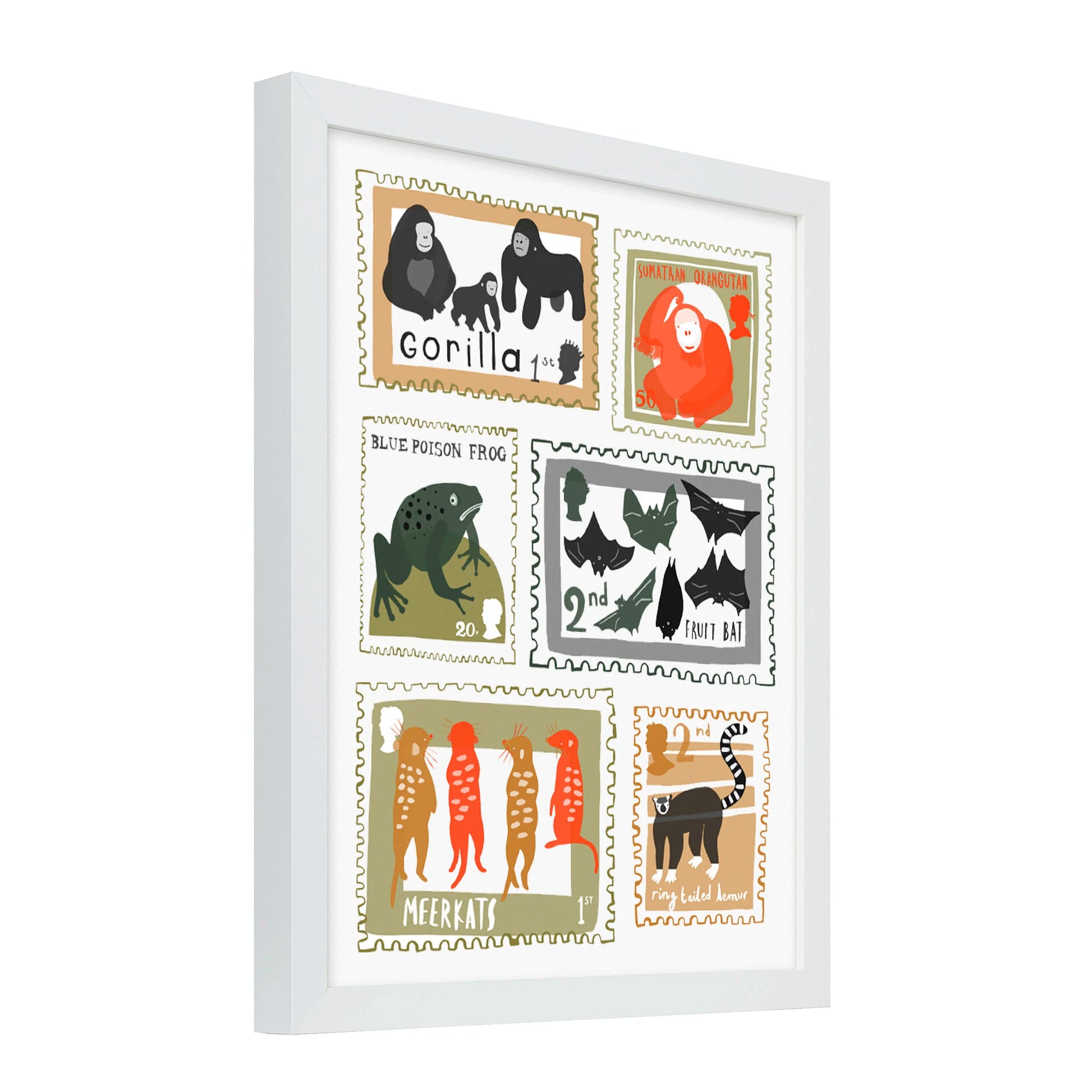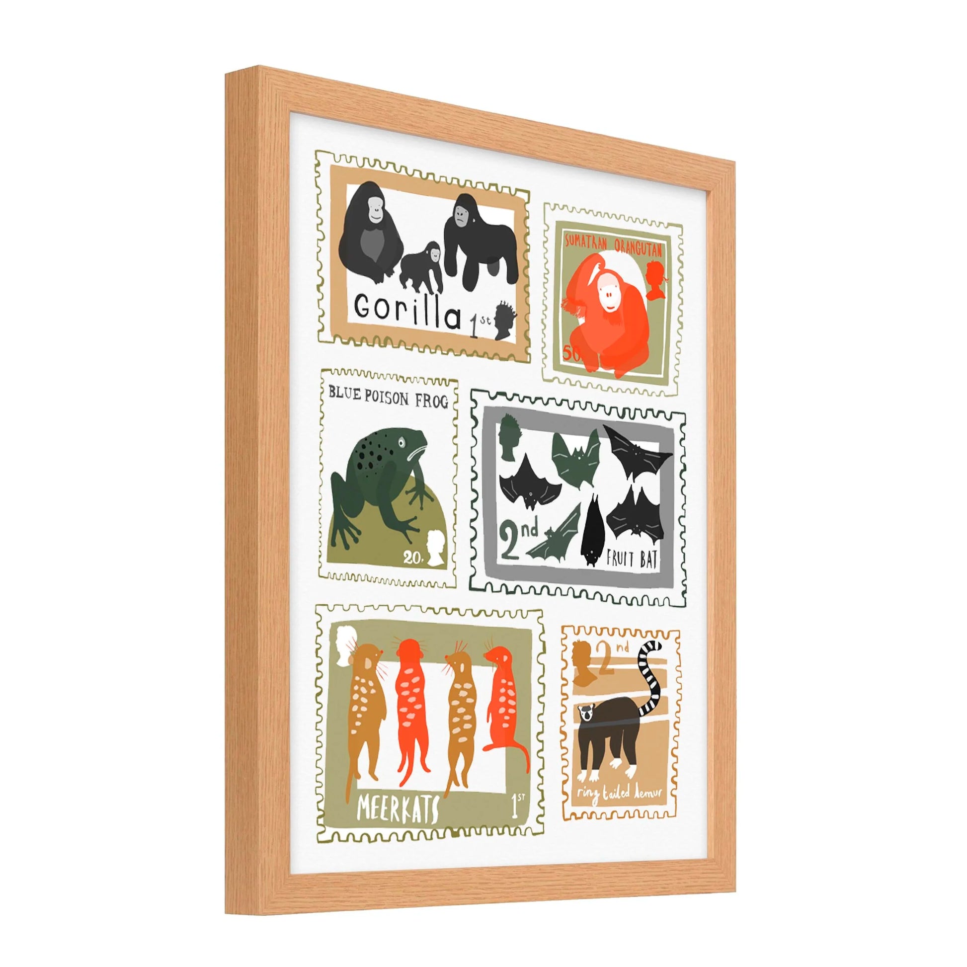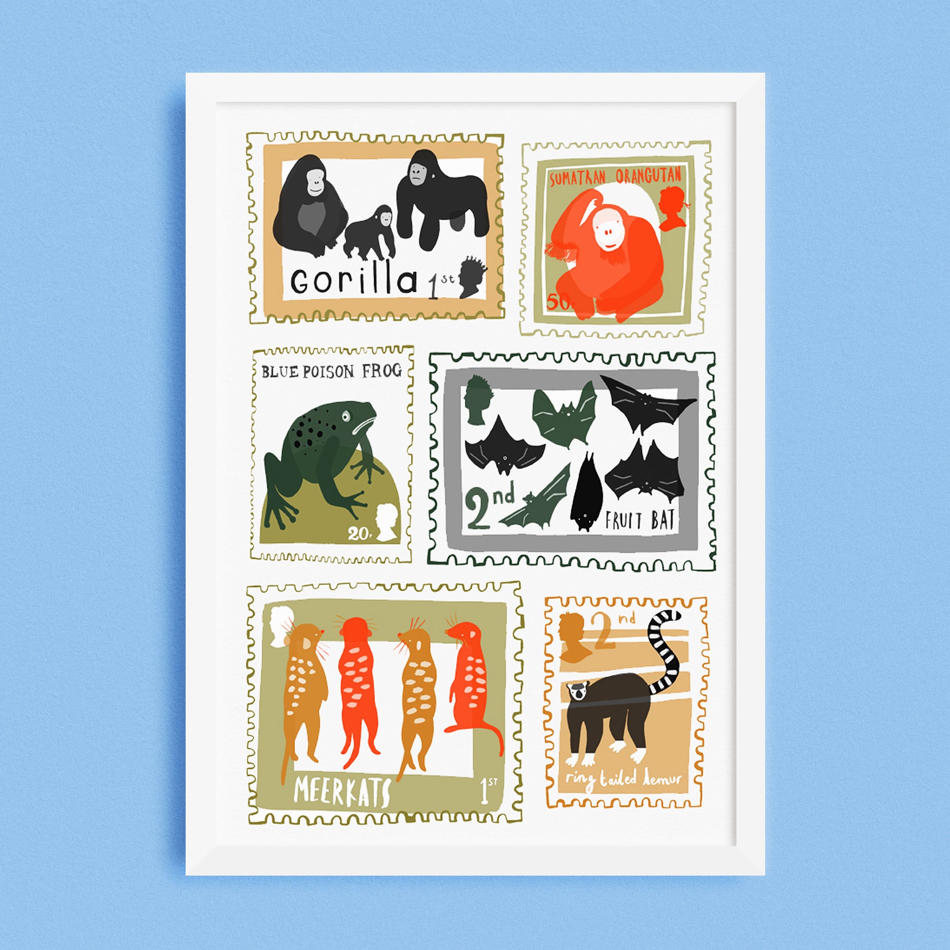 An original design by Lauren Radley featuring hand drawn cute illustrations of a variety of animals found at Durrell Zoo, in the playful format of postage stamps. Perfect for a children’s nursery or the home of any wildlife lover
